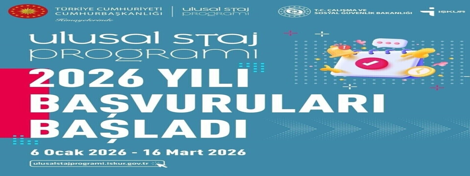 Cumhurbaşkanlığı Himayelerinde Türkiye İş Kurumu (İŞKUR) koordinasyonunda 2026 yılı “Ulusal Staj Programı” öğrenci başvuruları 06 Ocak 2026 tarihinde başlamış olup 16 Mart 2026 tarihine kadar devam edecektir.